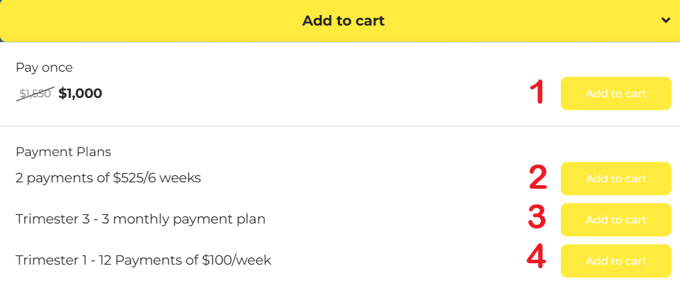 - In your email, advise us of your chosen payment plan and frequency (e.g. “Pay Once $1000,” “2 × $525,” “3 × $375,” “12 × $120,” etc.).